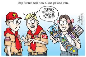 They have youth members between the ages of 7 and 21 and almost a million volunteers throughout the United States and its territories. It is amazing that the girls want to join the boys. Is it because they don’t want to have to sell those damn box cookies every year? The boys don’t have to do that. They get to go camping, make fires, learn how to make rope knots and build rope bridges. That stuff is cool!